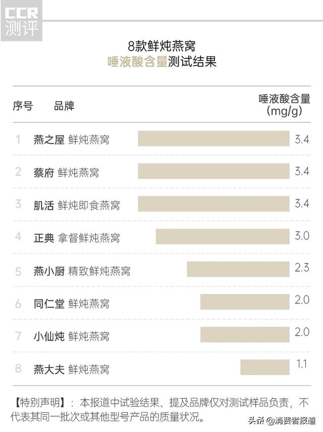测试结果显示,燕之屋、蔡府、肌活等3款鲜炖燕窝的唾液酸含量较高,均达到3.4mg/g的水平。