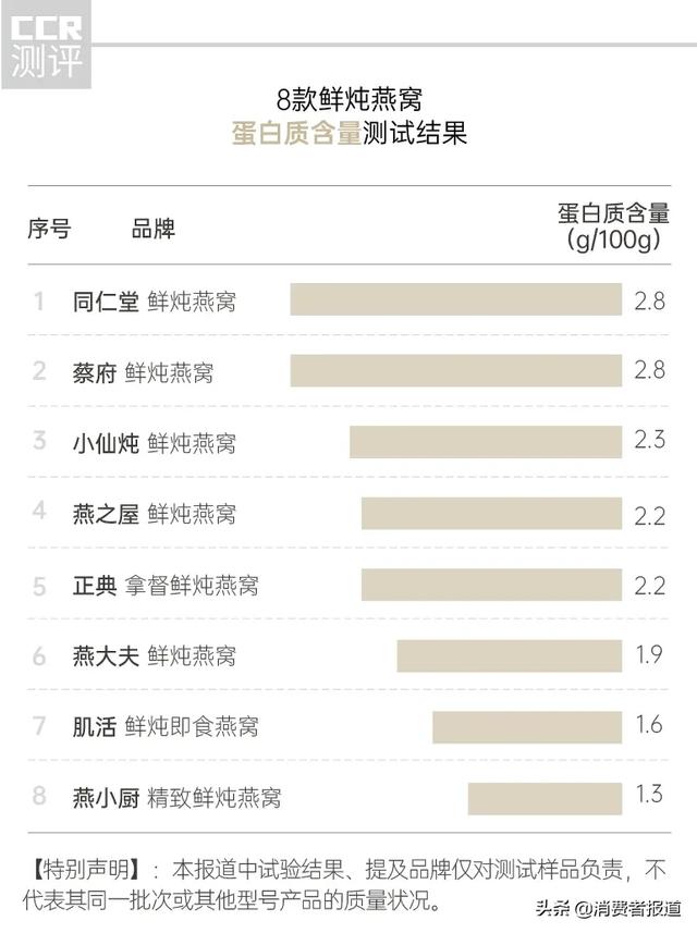 小仙炖、燕之屋、正典等3款则处于中等水平,蛋白质含量分别为2.3g/100g、2.2g/100g和2.2g/100g;同仁堂、蔡府等2款鲜炖燕窝蛋白质含量较高,均达到2.8g/100g。