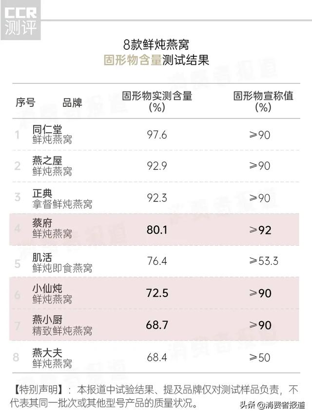 小仙炖、燕小厨、蔡府等固形物含量低于宣称值