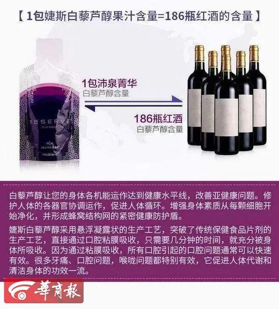 8月18日,记者看到婕斯的广告宣传页上称,一包婕斯白藜芦醇果汁含量等于168瓶红酒的含量,并有抗衰老等功能,婕斯会员登录网站上显示,奖励计划中分了10个等级,奖励金额从75美金到20000美金不等。而小杨父母平时食用的婕斯产品外包装上,并无任何中文字样。